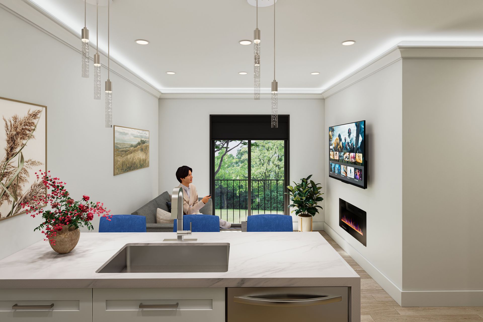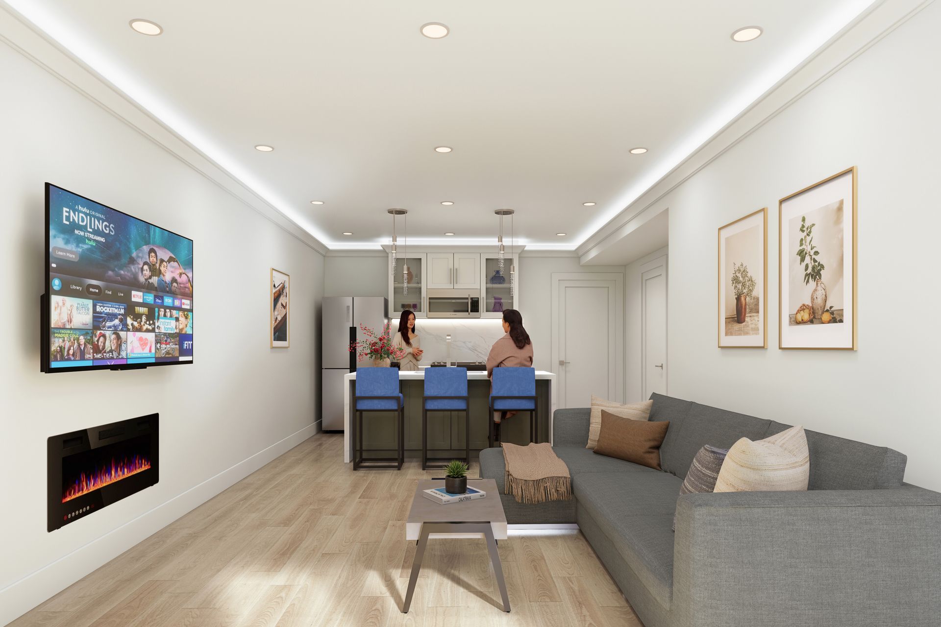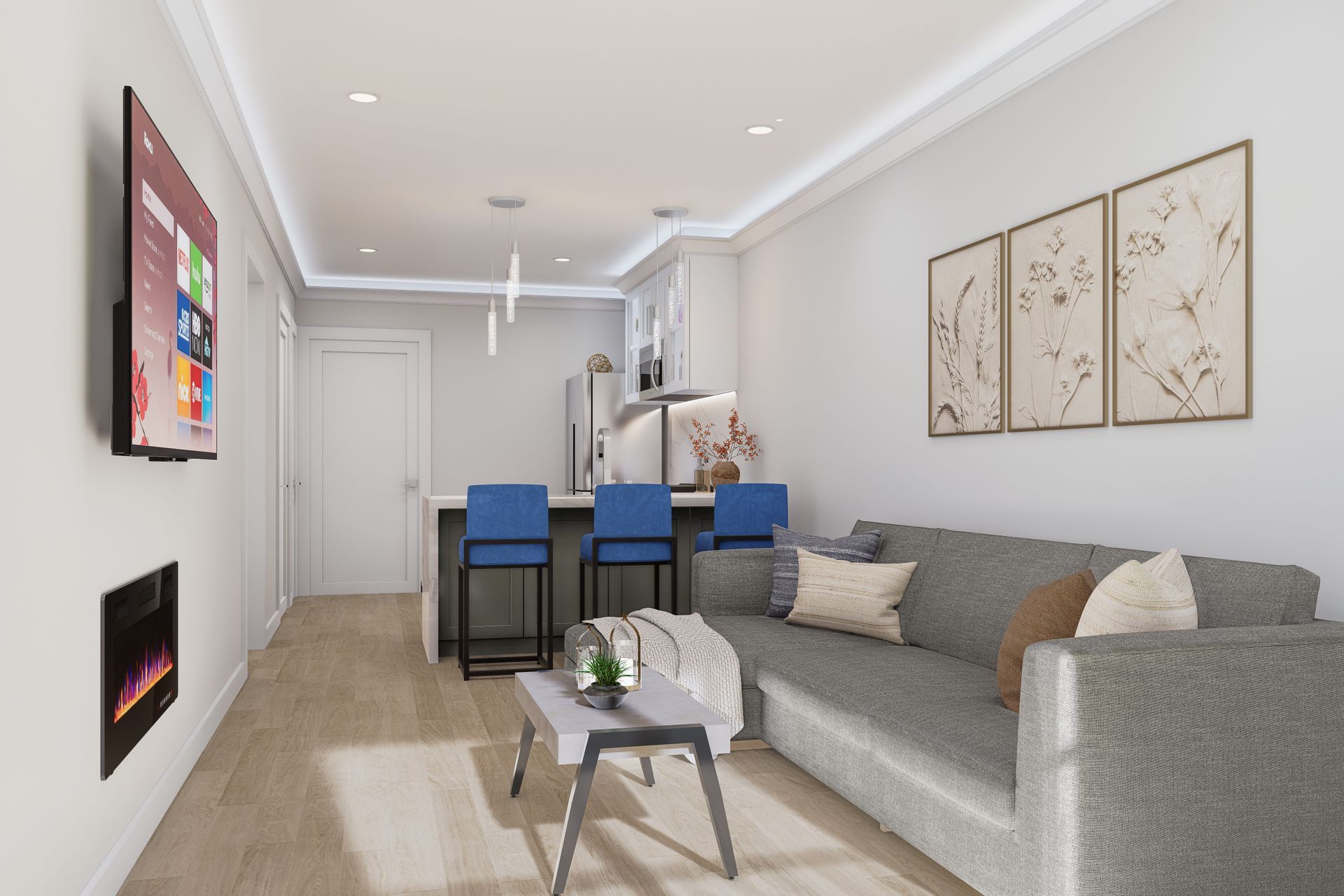 A sleek ambient LED fireplace and wall-mounted smart TV—perfect for relaxing nights in