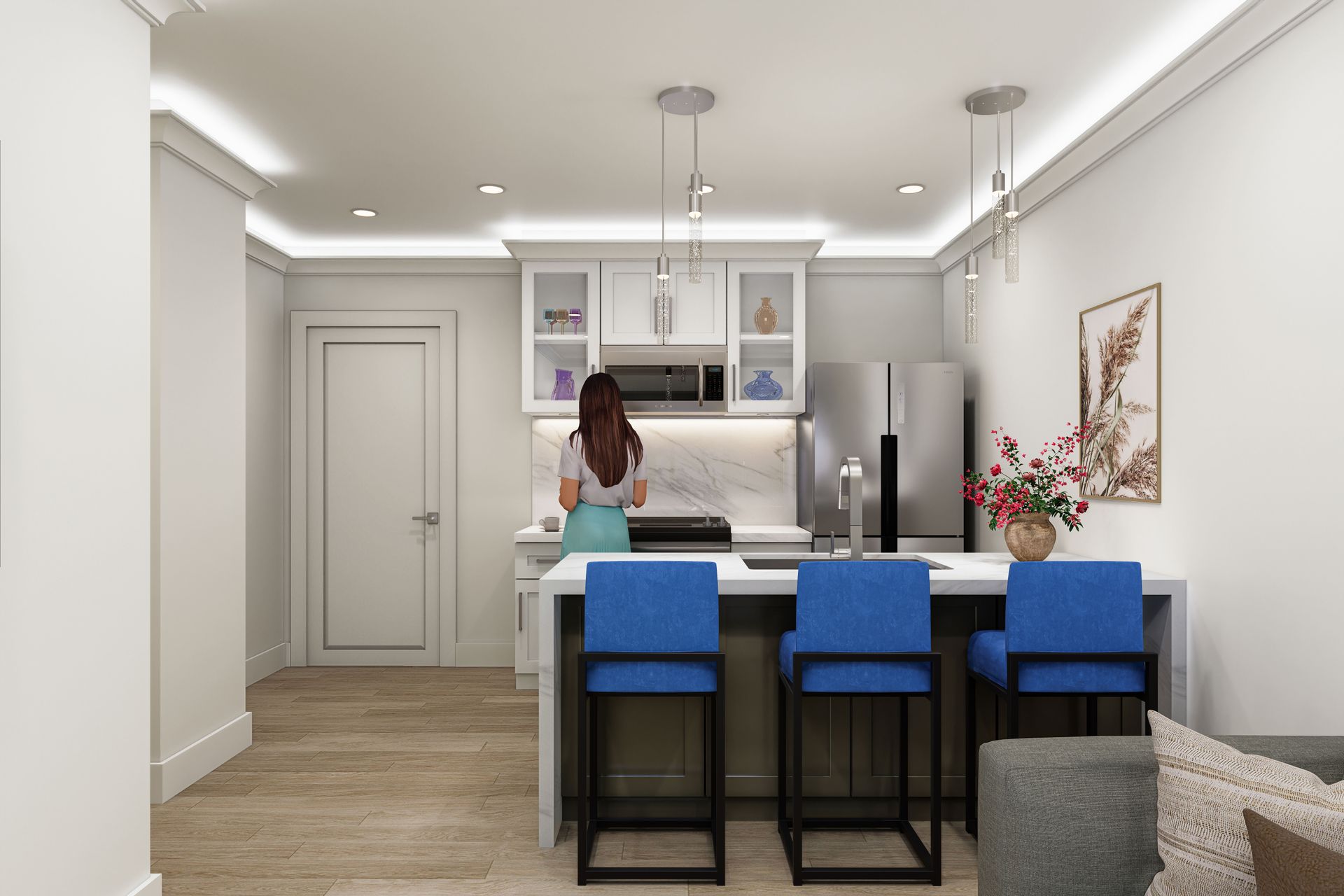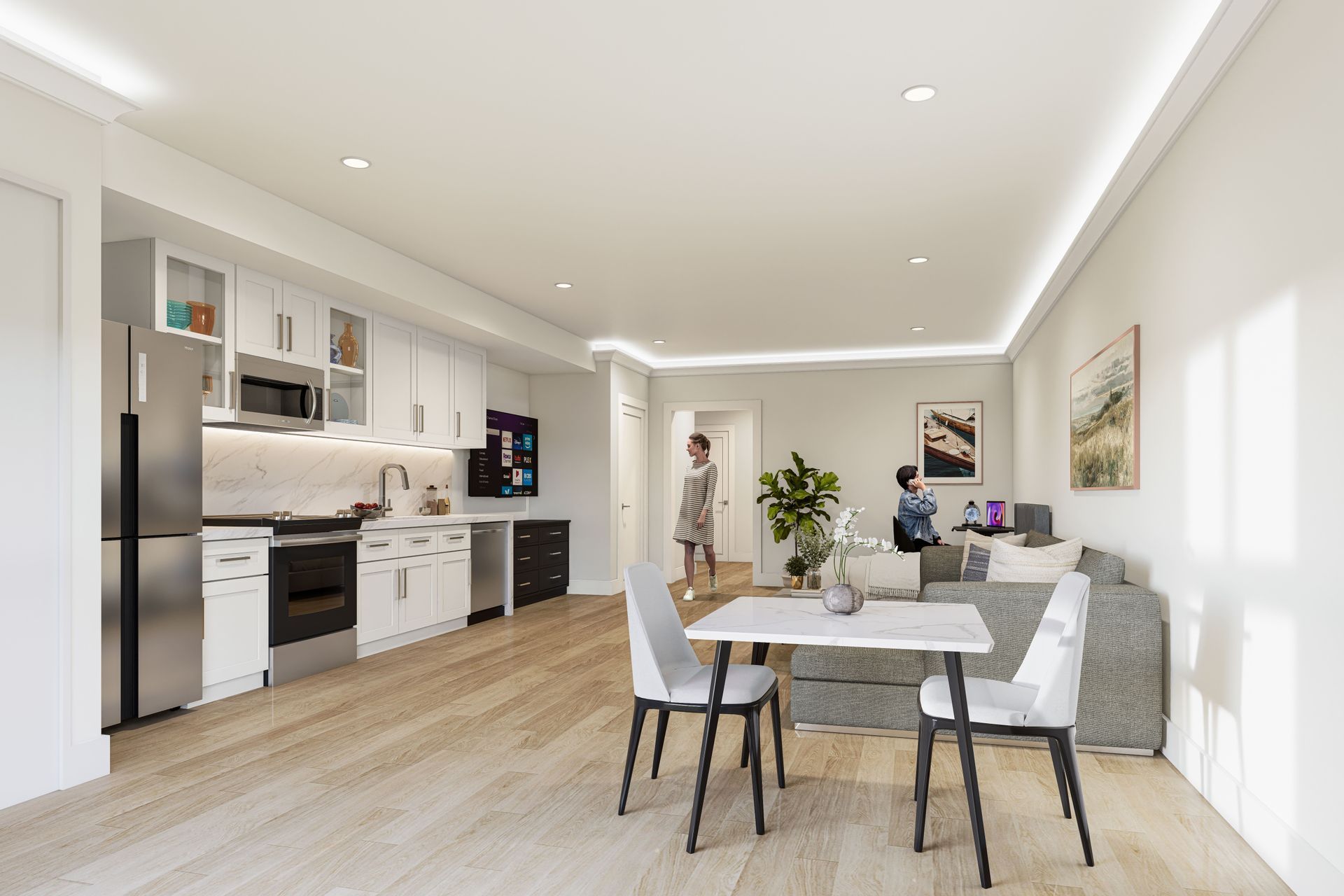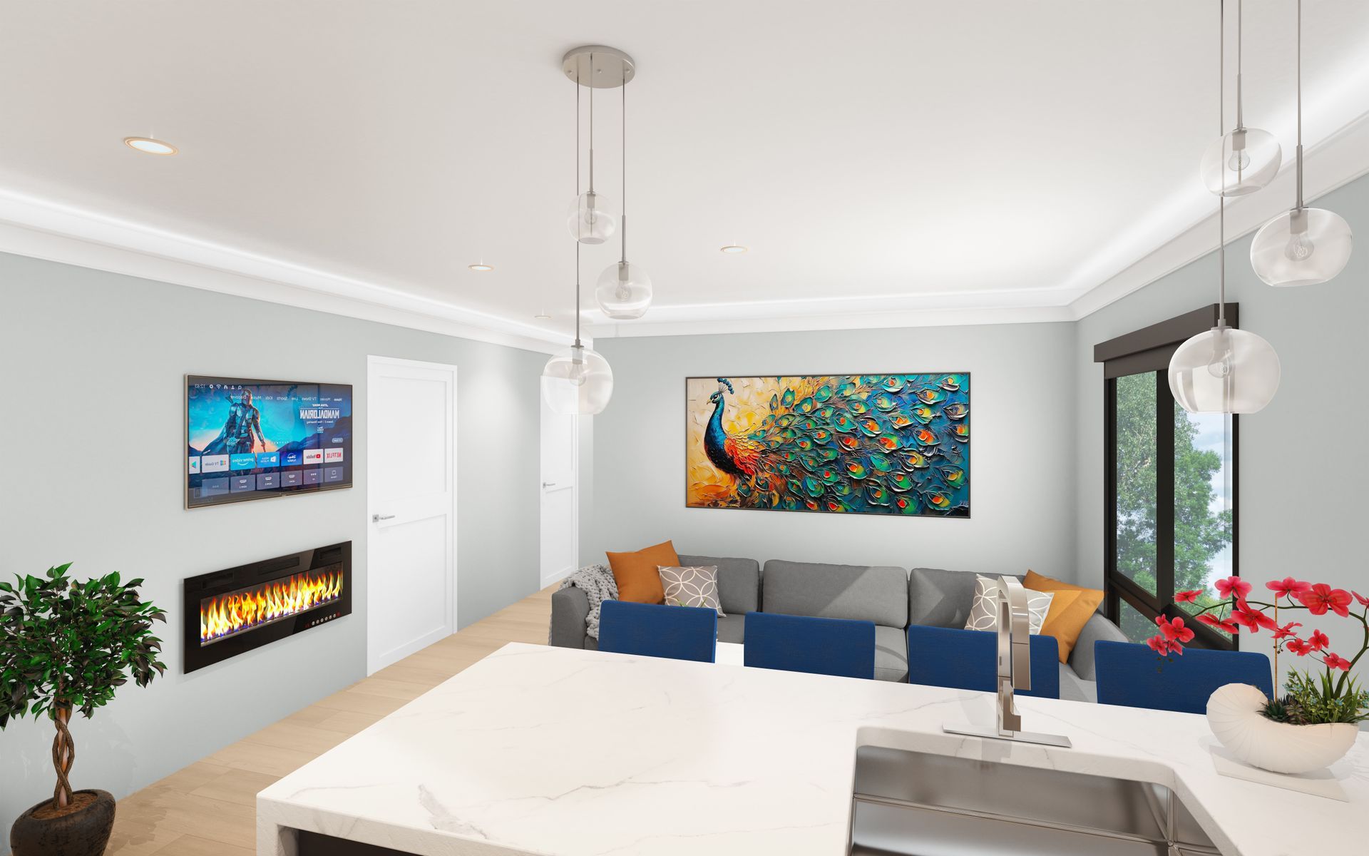 A sleek ambient LED fireplace and wall-mounted smart TV—perfect for relaxing nights in