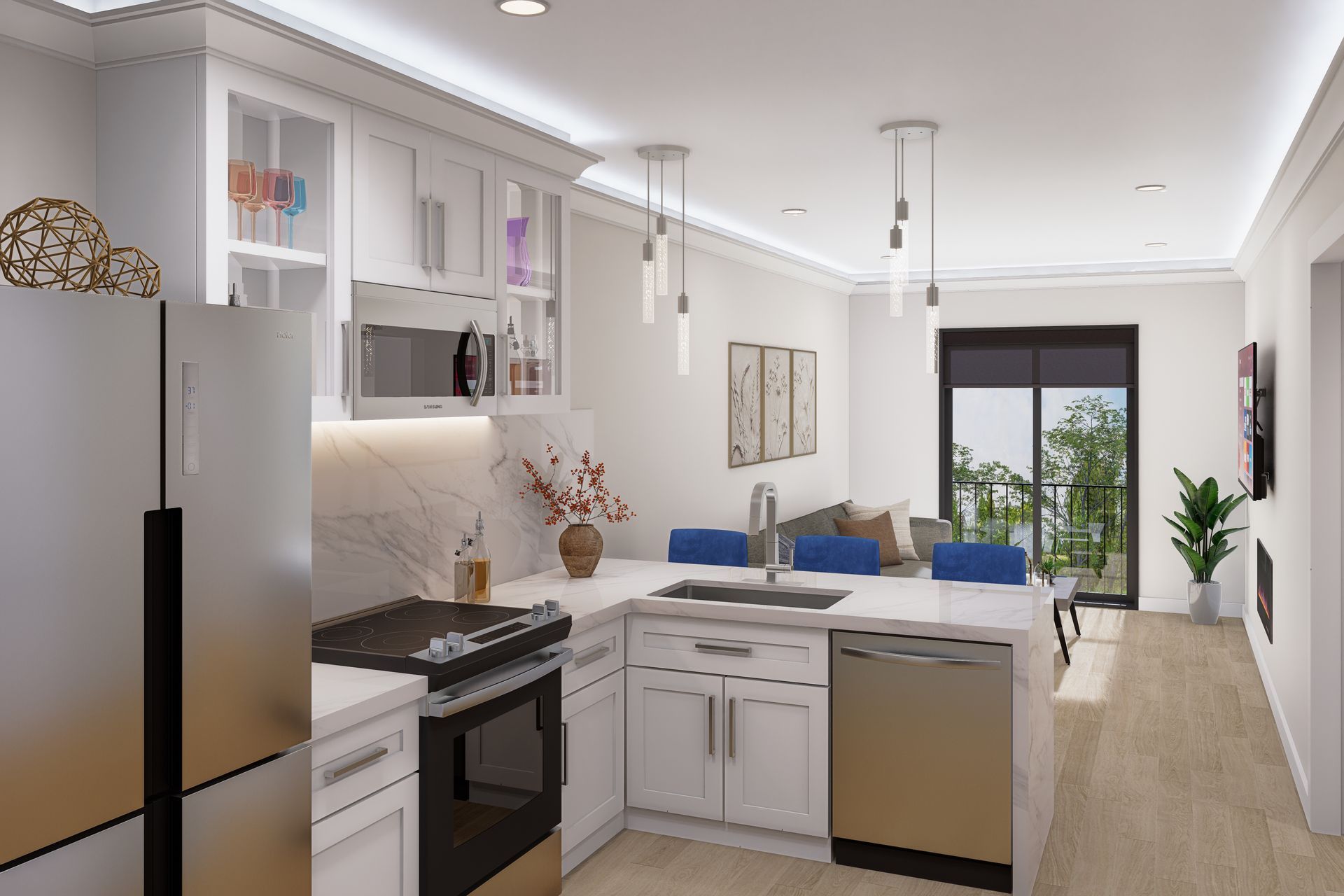 A chef-inspired gourmet kitchen with stainless steel appliances and luxe marbled quartz countertops